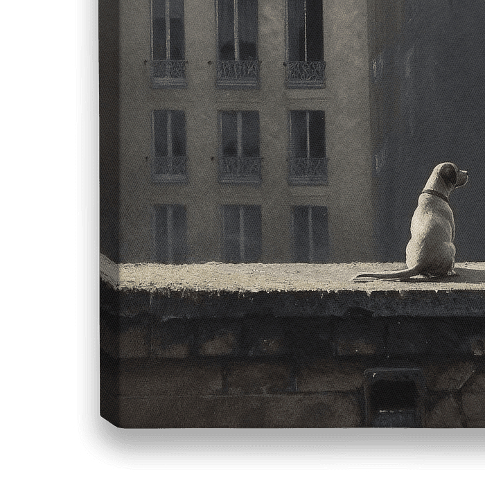 Dit schilderij legt een diep introspectief moment vast, waar de uitgestrektheid van de stad contrasteert met de intimiteit van gezelschap. Als kunstenaar wilde ik de stille band overbrengen tussen mens en hond, die beiden uitkijken over een uitgestrekt stedelijk landschap. De gedempte tinten en korrelige textuur waren opzettelijk en roepen een gevoel van nostalgie en tijdloosheid op, alsof deze scène in elk tijdperk thuishoort.