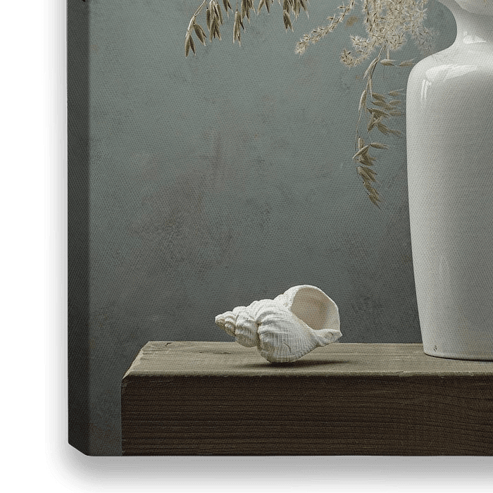 Stilleven verticaal van een slanke witte vaas met daarin verschillende grassoorten op een kleine vergrijsde massief houten tafel met een witte zeeschelp tegen een grijsachtige achtergrond met structuur.