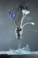 Stilleven verticale foto van een lang smal glas met lange steel met daarin een hyacint en een ander knolletje met bloempjes en een gekruld ijzerdraadje op een stukje bubbeltjesfolie op een dik vergrijsd tafelblad tegen een grijze muur