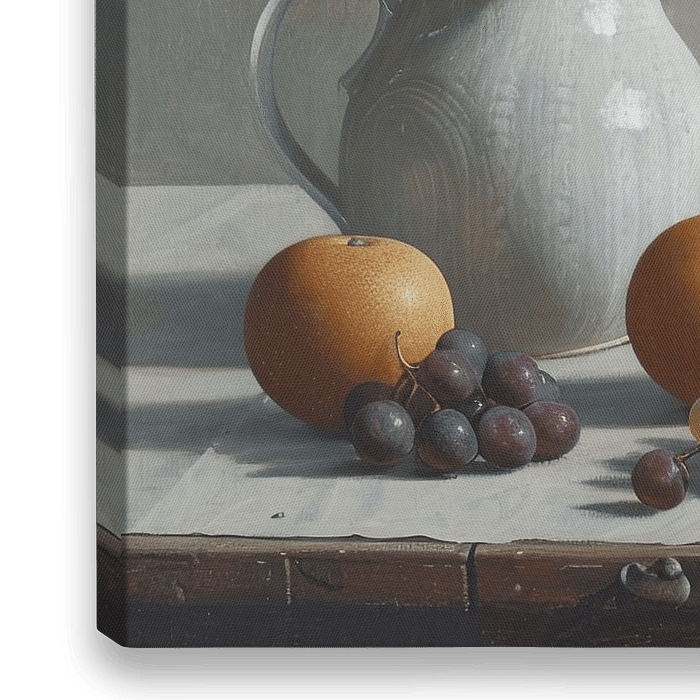 Stilleven | First Light Breakfast Tale - Dit stilleven schilderij toont een uitnodigend tafereel van een ogenschijnlijk alledaags ontbijt, met fraai weergegeven voorwerpen zoals een theepot, fruit, brood, en een kopje thee, zorgvuldig gerangschikt op een houten tafel, elk voorwerp zorgvuldig belicht en uitgelicht dat het een gevoel van…