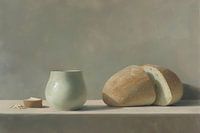 Stilleven | Muted Feast - Dit stilleven schilderij toont een rustiek tafereel met een gesneden brood en een aardewerk pot, uitgelicht door subtiele belichting die de texturen en vormen benadrukt.
