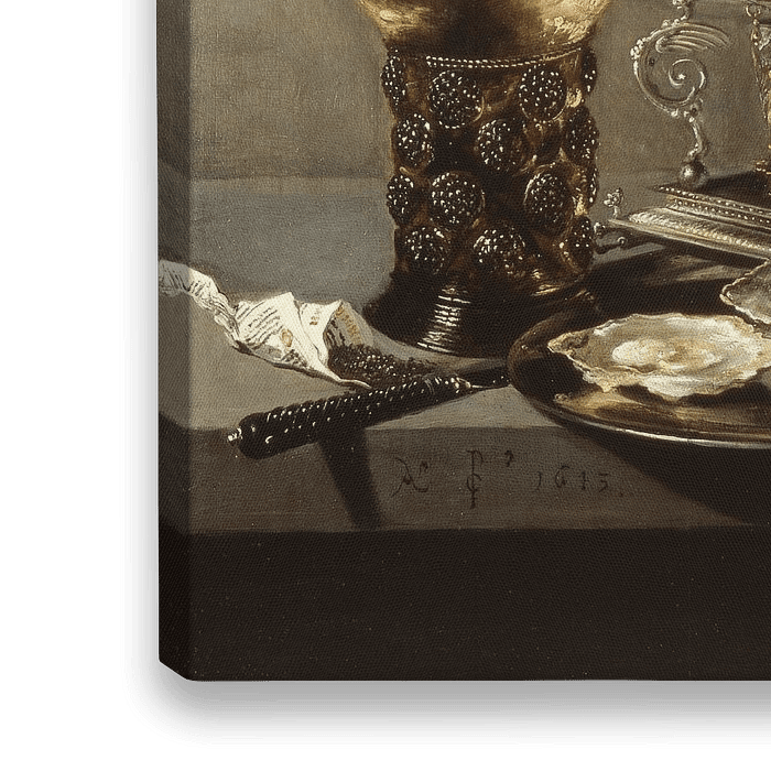 Dit ontbijtstuk, een naam gegeven aan eenvoudige groepjes voedsel en serveergerei, brengt een delicaat evenwicht tot stand tussen oppervlakte en diepte, horizontaal en verticaal. Ondanks de subtiele verhoudingen in kleur en vorm, houdt de groepering de toeschouwer bezig doordat het mes en het bord over de tafelrand uitsteken om een verband te suggereren tussen de werkelijke ruimte van de toeschouwer en de fictieve wereld die de kunstenaar heeft geschapen. Geschilderde voorstellingen van dagelijkse voorwerpen waarvan de schoonheid kan vervagen, en voedsel dat na verloop van tijd kan bederven, waren vaak bedoeld om aan te zetten tot meditatie over de kortstondigheid van het leven en de immateriële aard van de deugd.