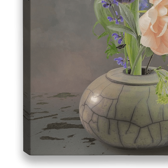 Stilleven verticale fotocollage van een raku gestookte vaas (van Carla Teer) met daarin een eenvoudige compositie van pioenrozen, tulpen en delphinium tegen een donkere grijzige wolkige lucht.