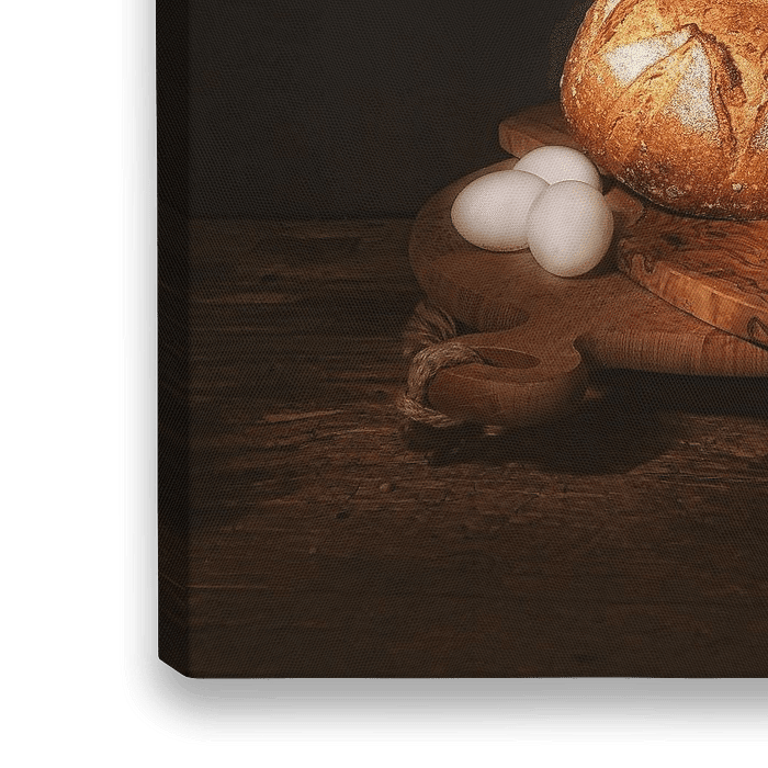 Met dit stilleven heb ik de schoonheid van simpele dingen vastgelegd , met het licht dat herinnert aan de oude meesters .Het warme licht brengt warmte in uw kamer en de sfeer van vers gebakken brood . Leuk door zijn vierkante formaat . ook leuk als muurbehang . Makkelijk inpasbaar.