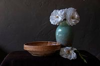 Modern stilleven in gedempte tonen met lente rozen in groene vaas en aardewerk schaal