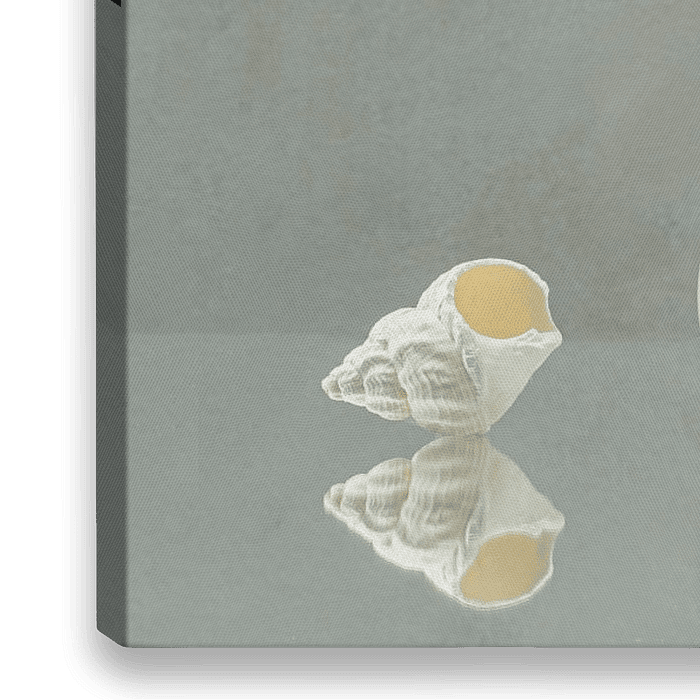 Stilleven langwerpig horizontaal van 5 identieke witte vaasjes met daarin 5 tulpjes waarvan 1 roze en 4 wit. Op een spiegelende ondergrond met daarbij een witte zeeschelp tegen een grijze achtergrond.