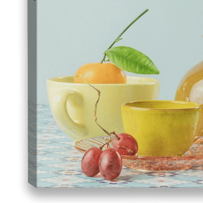 Stilleven verticale foto van een oudroze glazen gebaksbordje met daarop een klein geel kommetje en daarbij een lichtgele kop en een amberkleurig geel glazen vaasje. Samen op een retro tafelzeil tegen een zeegroene achtergrond. Een mandarijntje, een ranonkel in knop en een takje rode druiven maken het geheel speels.