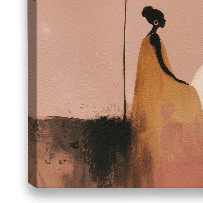 Een minimalistisch maar warm portret van een vrouw onder een tropische boom, terwijl de zon langzaam zakt aan de horizon. De zachte aardetinten en het silhouet geven het werk een serene, meditatieve uitstraling. Perfect voor interieurs die rust, warmte en een vleugje exotische sfeer willen toevoegen.