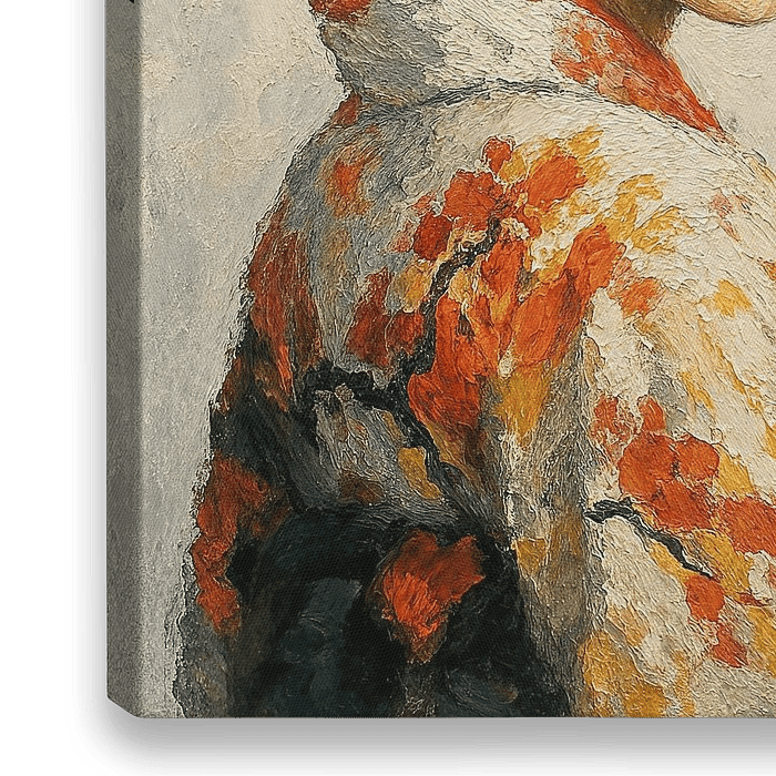 Op dit schilderij zien we een jonge vrouw in een sierlijke kimono, die zich subtiel omdraait en de kijker direct aankijkt. De dikke, levendige penseelstreken brengen haar tot leven; het rode haarornament, de zachte schaduw onder haar kin en de gelaagde textuur van haar kleding maken dit werk uniek. De sfeer is verstild en intiem, met…