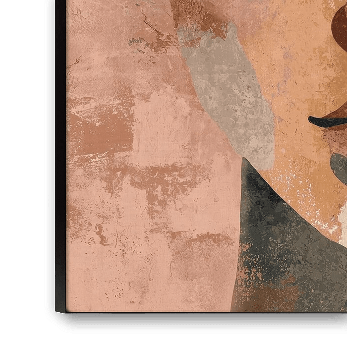 Abstract portret waarin de contouren van een gezicht subtiel zijn weergegeven met geometrische vormen en zachte kleurvlakken. De warme tinten van terracotta, beige, oker en zachte grijstinten lopen in elkaar over, waardoor een harmonieus geheel ontstaat. De huidstructuur lijkt bijna verweerd, alsof het portret in een muur of steen is vastgelegd, wat het werk een tijdloze, bijna monumentale uitstraling geeft.
