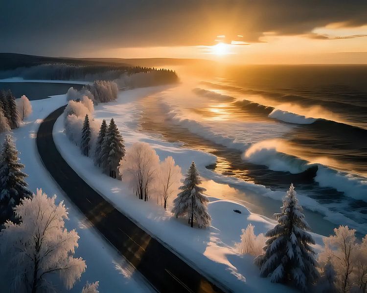 De foto legt een indrukwekkend, besneeuwd winterlandschap vast midden in een storm, terwijl aan de horizon een dramatische zonsondergang de scène in gloeiende kleuren hult. Dichte sneeuwbuien razen over open velden en bosranden, drijven mee in vlagen en trekken dynamische lijnen door de lucht; fijne sneeuwkristallen. De foto toont een…