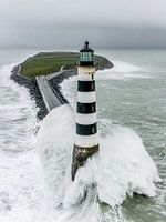 Koop dit digital art kunstwerk Stormvloed bij de eenzame vuurtoren van Klaus Tesching - Art-AI als reproductie op canvas, aluminium dibond, (ingelijste) fotoprint, behang en ArtFrame, op maat geprint in Fine-Art kwaliteit.