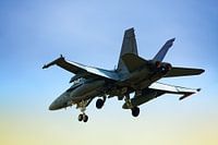 F18 overvliegende, op zoek naar de landingsbaan, op zeer korte afstand. McDonnell Douglas F/A-18 Hornet.