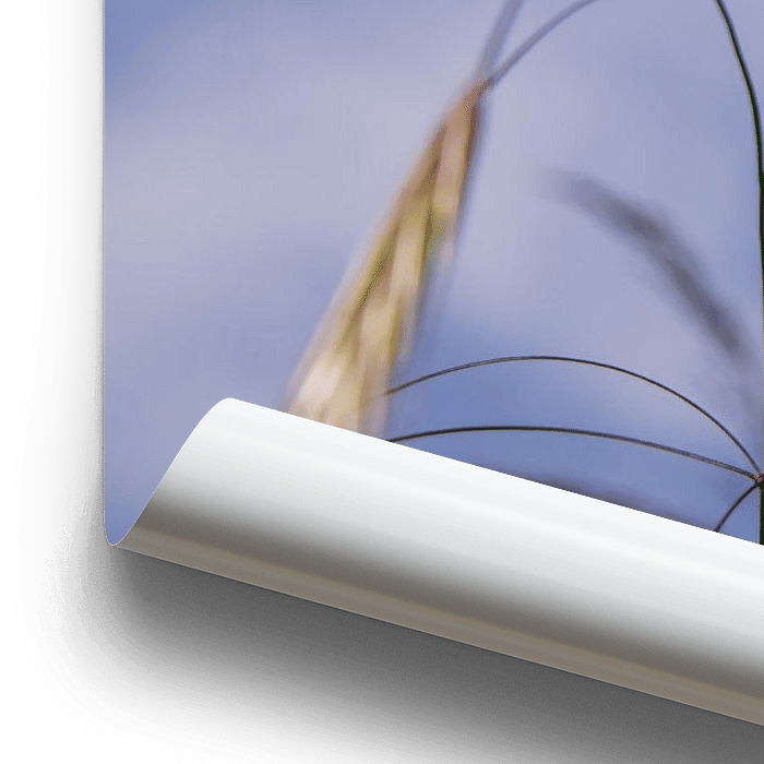 Deze prachtige foto toont een stralende rode klaproos, een icoon van sierlijke eenvoud, die sierlijk tussen hoge graspluimen langs de weg staat. De bloem wordt van onderaf vastgelegd tegen een heldere blauwe lucht, terwijl het zonlicht subtiel door de delicate bloembladeren schijnt. Eén van de bloembladeren ontbreekt, waardoor je een…