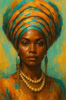 Deze indrukwekkende vrouw straalt kracht en elegantie uit, met haar kleurrijke hoofddoek, gouden sieraden en zelfverzekerde blik. Een ode aan Afrikaanse schoonheid, cultuur en expressie in een schilderachtige stijl vol diepte en warmte.