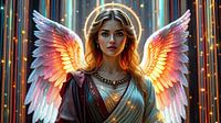 De prachtige engel zweeft zachtjes in een hemel van pastelkleuren die een gevoel van vrede en harmonie verspreiden. Zijn grote, vederlichte vleugels zijn een fascinerend kleurenspel van iriserend blauw, zacht roze en stralend goud. Elke vleugelslag is een symfonie van licht die de omgeving in een warme, gouden gloed hult.