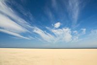 Minimalistische weergave van het strand, zee en blauwe lucht met wolken.
