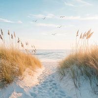 Een zacht pad van fijn zand baant zich een weg door hoog, goudkleurig gras dat zachtjes wiegt in de wind. De oceaan glinstert in helder blauw, terwijl vogels over het glinsterende wateroppervlak glijden. Een gevoel van vrijheid en rust vult de lucht, terwijl de lucht oplicht in zachte pasteltinten, waardoor de kust verandert in een…