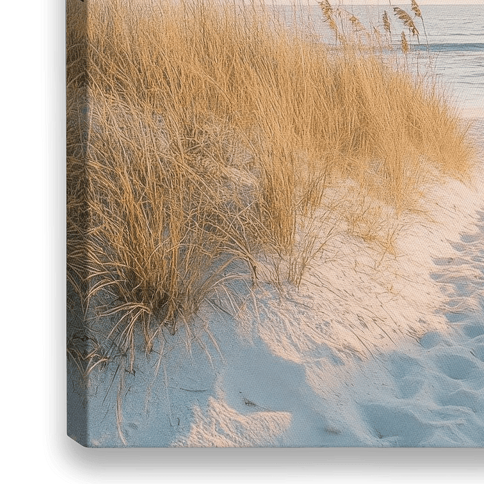 Een zacht pad van fijn zand baant zich een weg door hoog, goudkleurig gras dat zachtjes wiegt in de wind. De oceaan glinstert in helder blauw, terwijl vogels over het glinsterende wateroppervlak glijden. Een gevoel van vrijheid en rust vult de lucht, terwijl de lucht oplicht in zachte pasteltinten, waardoor de kust verandert in een…