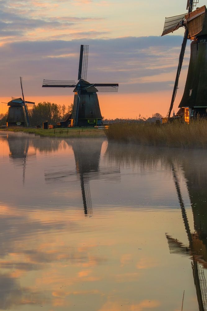 Veel toeristen gaan naar Kinderdijk om een mooie rij molens te zien, maar ook in Noord-Holland is dit tafereel te vinden. Zoals deze drie strijkmolens in Rustenburg, prachtig belicht door de opkomende zon en met een mooie weerspiegeling in het rustige water.