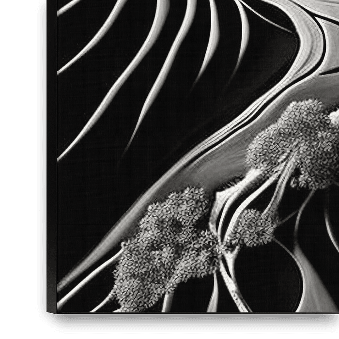 River of Lines toont een opvallend monochroom landschap waarin een rivier elegant door gestileerde bergruggen en boomgroepen meandert. Het dramatische gebruik van zwart en wit versterkt het visuele contrast, terwijl zachte rondingen en ingewikkelde patronen diepte en beweging toevoegen. Dit kunstwerk combineert natuurlijke inspiratie…