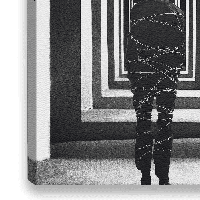 Soms, overweldigd door teveel keuzes of door een depressie is het moeilijk überhaupt één stap te zetten. Zwart-wit fotokunst met grunge filmkorrel.