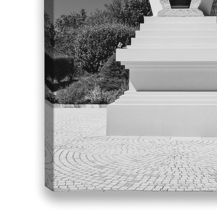 Een witte stoepa bij de boeddhistische tempel Dhagpo Kagyu Ling in de Dordogne in Frankrijk. Een interessante opname met het symmetrische ontwerp van de stoepa en de contrastrijke zwart-wit tinten, zoals hij hoog staat te midden van de rustige tuin. De prachtige tuin biedt een harmonieuze achtergrond, waardoor dit een fascinerend beeld is van een plaats van contemplatie en meditatie.