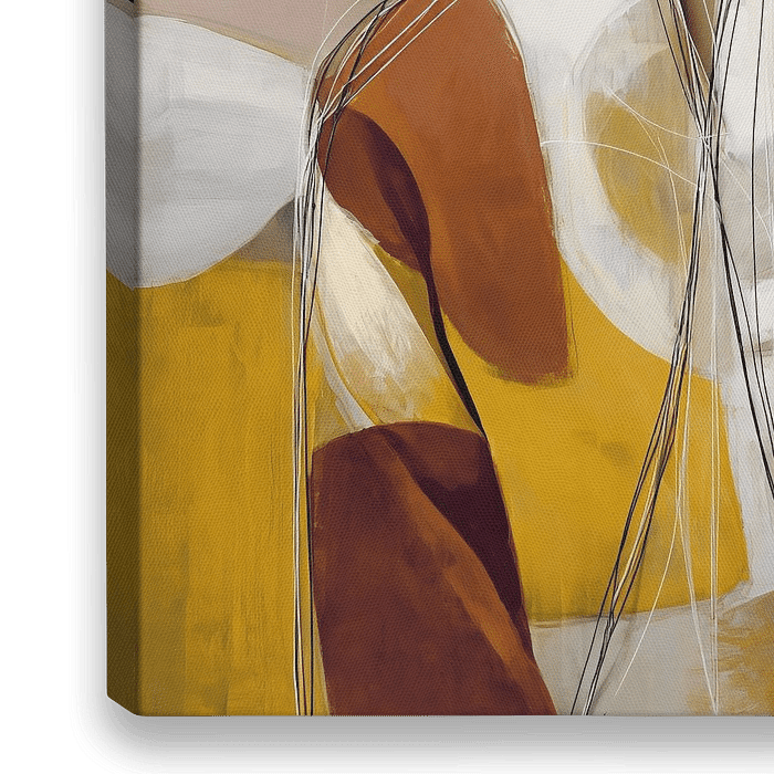 Abstract mixed media portret van een vrouw met verf en lijntekening elementen in voornamelijk geel, wit en bruin tinten.