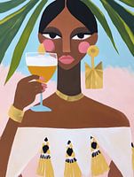 "Summer vibes", kleurrijke en hippe illustratie. Een jonge vrouw heft het glas op de zomer: proost! Een bijzondere blikvanger voor je interieur, helemaal in de trend van nu.