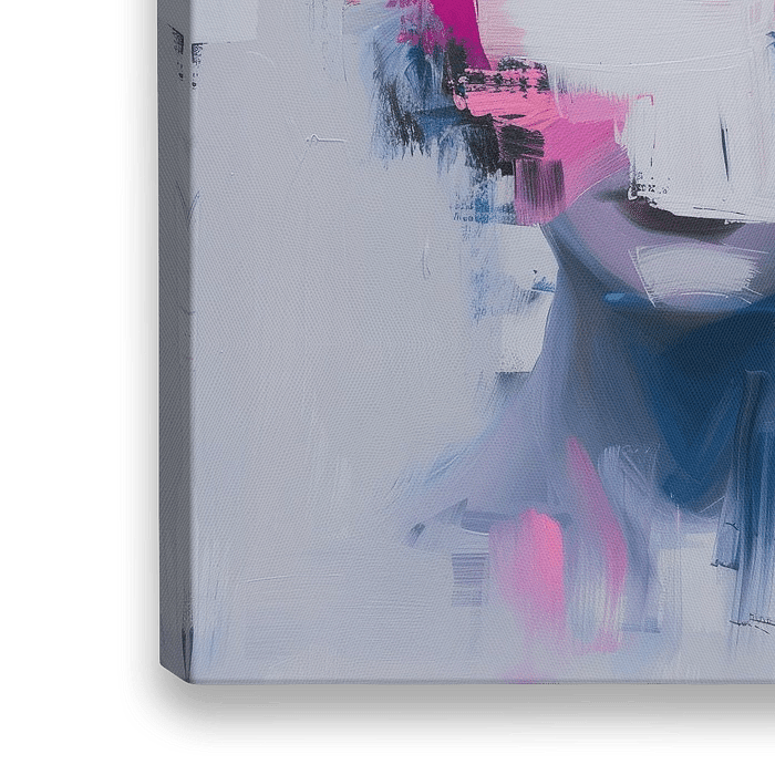 Super kleurrijk modern en abstract portret van een jonge vrouw met verfstrepen over haar gezicht. Een bijzondere blikvanger voor je interieur! Voor wie van kleur houdt! In blauw, oranje, roze en wit.