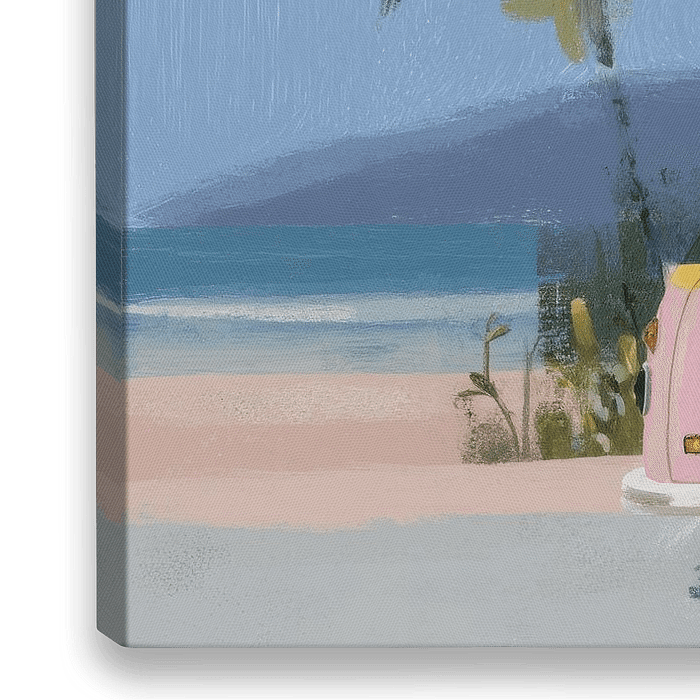 Een roze-geel retrobusje met surfplanken op het dak, palmbomen die loom wiegen in de wind en een zomerse vibe die je spontaan je schoenen laat uitschoppen — welkom op een zonovergoten stranddag in Brazilië. Dit werk barst van de good vibes: je hóórt bijna de zee ruisen en de flipflops flappen.