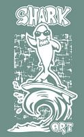 Strak en eigentijdse illustratie van een haai op een surfboard. Portret formaat in twee kleuren, wit en blauw. Past in jouw moderne interieur