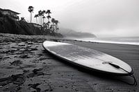 De grijze tinten van deze foto wekken een gevoel van rust en eenzaamheid. Het mistige landschap op de achtergrond, met de wazige contouren van palmbomen en een onherkenbare kustlijn, draagt bij aan de serene atmosfeer. Centraal in het beeld ligt een verlaten surfplank op het donkere zand, die een verhaal van avontuur en passie…