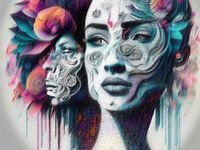 De vrouw kijkt opzij en een mannenhoofd is achter haar met de kleuren oranje, paars, grijs, wit en blauw. Beide portretten zijn deels gemaskerd.