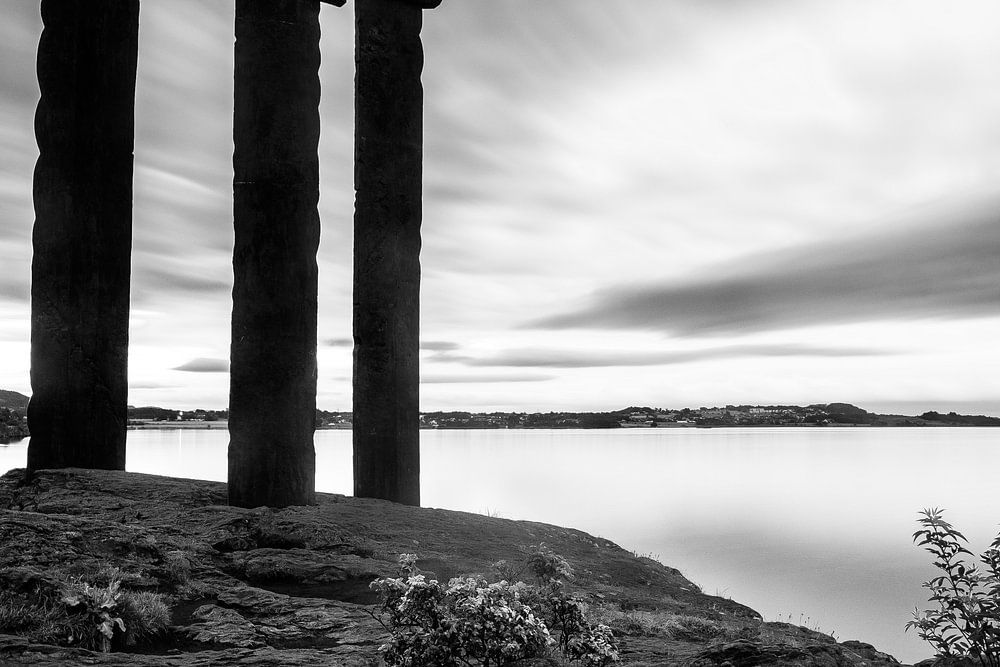 Deze lange belichtingstijd foto van drie grote zwaarden in de rotsen bij Stavanger in Noorwegen, is gemaakt tijdens het blauwe uur op een Zomeravond in Augustus 2023