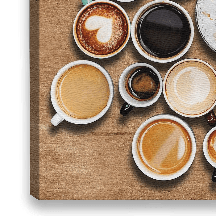 Collage van diverse soorten kopjes koffie, op een houten tafelblad.