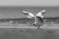 Lucht onder je vleugels , vrijheid om je heen . Een meeuw stijgt op van het Noordzeestrand in Oostende