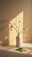 Takken van perzikbloesem in witte vaas die schaduwen werpen in warm zonlicht