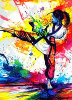 Deze kleurrijke illustratie toont een Tang Soo Do vechtkunstenares in een krachtige trapbeweging naar de Yoko Geri. Ze draagt een traditioneel vechtsportpak met een zwarte band, wat duidt op haar hoge ervaringsniveau. De achtergrond is ontworpen met intense, levendige kleurspatten die dynamiek en energie overbrengen. De combinatie van…