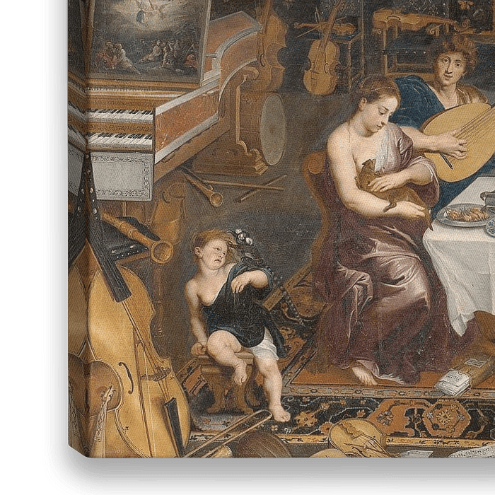 Dit schilderij is een symbolische voorstelling van drie van de vijf zintuigen, namelijk gehoor, tast en smaak. Het bijbehorende schilderij toont de andere twee zintuigen, namelijk gezicht en geur.