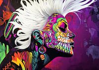 Details: vrouw schilderij, kleurrijke make-up schilderij, gezicht beschilderd, moderne kunst, kleur, vrouw, oorbellen, wit, zwart, paars