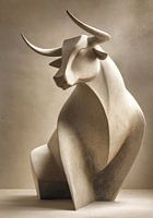 Sculptuur portret van een stier in bruin en beige tinten.