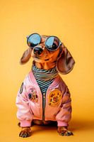 Een chique teckel in een felroze jasje, die vol zelfvertrouwen poseert met een coole zonnebril. Zijn vriendelijke gezicht straalt charme en karakter uit, terwijl de gestreepte sjaal hem een speelse touch geeft. Deze kleine trendsetter brengt een frisse wind in de hondenmodewereld en inspireert met een onweerstaanbare look!