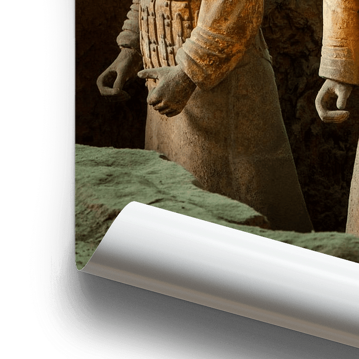 Close up van een aantal beelden in het beroemde Terracotta leger in Xi'An. Op de foto zijn een 3-tal rijen met soldaten te zien.