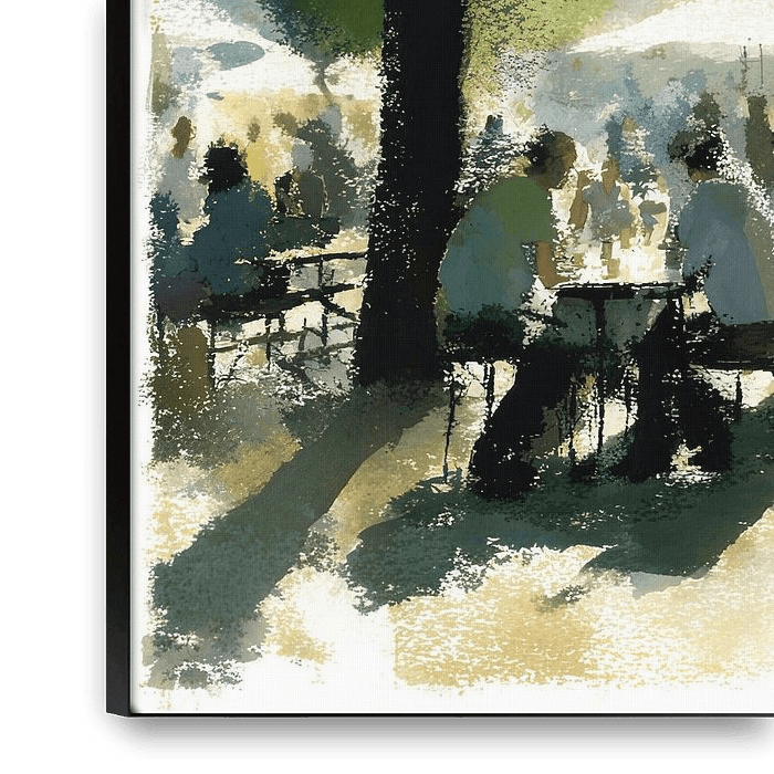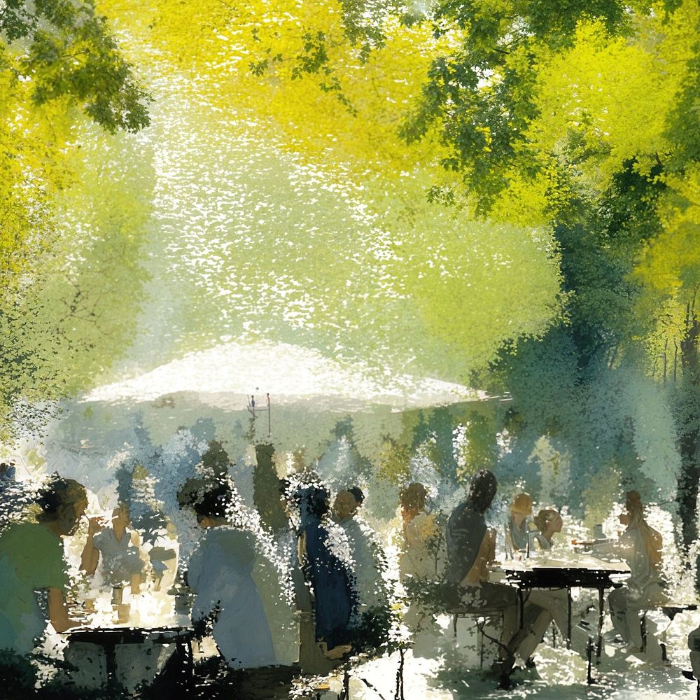 Deze aquarel toont een terras in een biertuin onder hoge bomen. Mensen zitten verspreid aan kleine tafels. Anderen staan of lopen door de ruimte. De stijl is aquarel met losse penseelstreken. Vormen zijn zacht en deels vervaagd. Het kleurenpalet bestaat uit groen, geel, beige en grijs. Het licht filtert door het bladerdak.