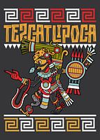 Deze afbeelding toont Tezcatlipoca met een jaguarmasker en een rijkelijk versierd schild. De figuur draagt talloze ornamenten, symbolen en wapens die zijn rol als god van het lot, de nacht en magie belichamen. De achtergrond met geometrische patronen versterkt het rituele en mystieke karakter van het motief.