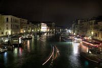 Een blik vanaf de welbekende Rialto Bridge met zicht op de Canal Grande in Venetië waar het een komen en gaan is van bootjes, ook 's avonds.