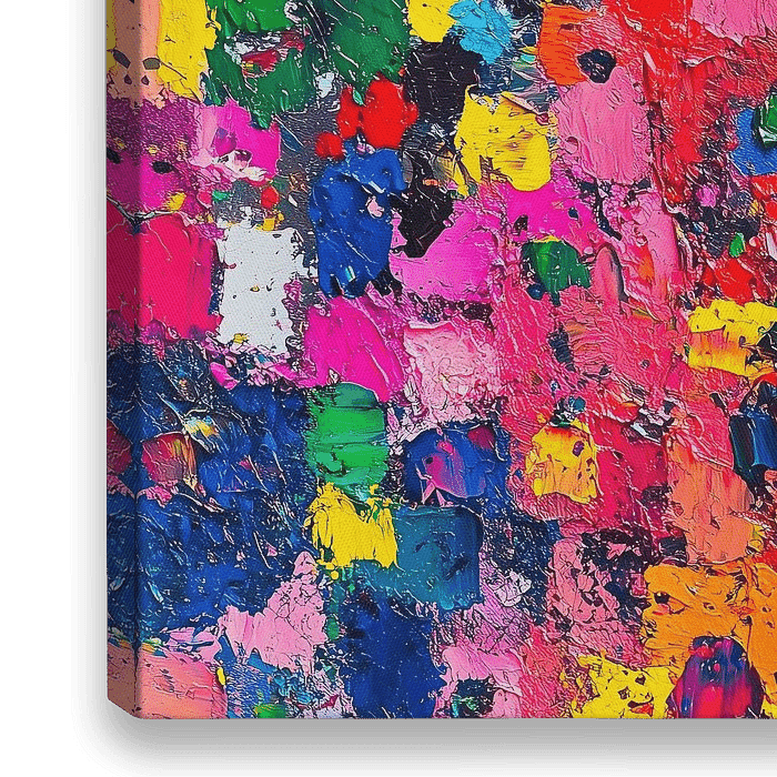 Een abstracte compositie gekenmerkt door een levendige en chaotische combinatie van kleuren en texturen, de verf is dik en gestructureerd aangebracht, waardoor een driedimensionaal effect ontstaat met zichtbare penseelstreken en verflagen. De compositie is chaotisch maar harmonieus zonder duidelijk focuspunt, waardoor het oog van de…
