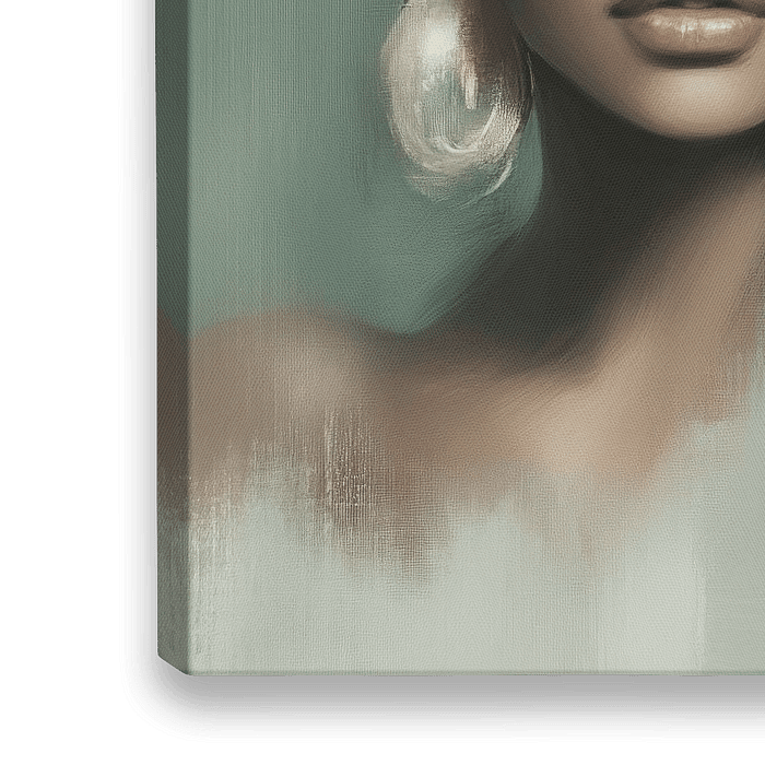 The Lady in Green, modern en abstract portret van een vrouw met hoed en grote oorbellen in groentinten. Een bijzondere blikvanger voor je interieur! Kies zelf het formaat en materiaal bij dit werk en maak het helemaal naar wens.