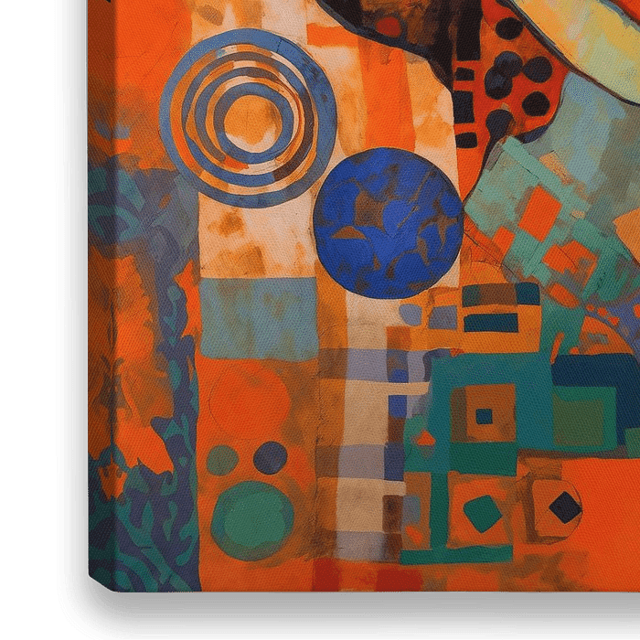Een abstract portret van een vrouw met een opvallende peinzende uitdrukking. Het gezicht van de vrouw kenmerkt zich door een mozaïek van kleurrijke geometrische patronen die naadloos overgaan in de achtergrond. De achtergrond is gevuld met warme tinten met een scala aan geometrische vormen wat een dynamische en gelaagde compositie…